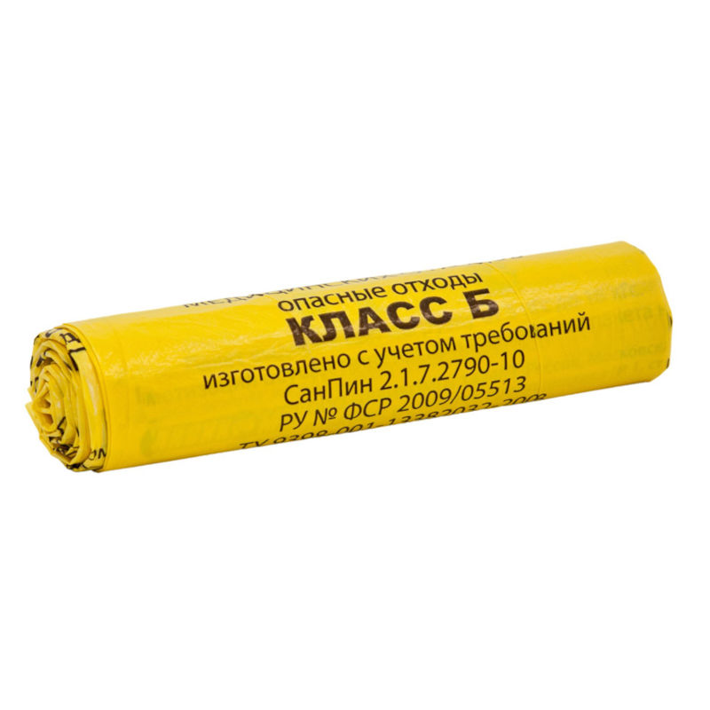 Пакет для утилизации медицинских отходов класса Б, который обеспечивает безопасность и гигиену во время удаления загрязненных предметов, содержащих выделения и кровь пациентов, инфицированные материалы из патологоанатомических отделений, лабораторий, операционных и ветеринарных клиник. Размер пакета составляет 800*900 мм, он является желтым (для отходов класса Б) и имеет толщину 14 мкм.